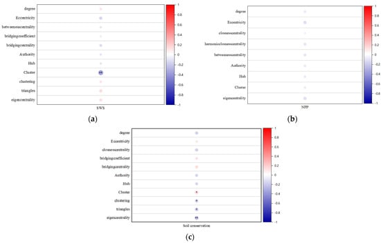 (3) Correlation between topological indicators and ecological service functions: The windbreak and sand fixation service capacity index in the study area showed a very strong negative correlation with cluster, with a confidence level of 99%. Moreover, it exhibited a strong negative correlation with eccentricity and bridging centrality, and a strong positive correlation with triangles and eigencentrality. Soil conservation was found to have a very strong negative correlation with eigencentrality, with a maximum confidence level of 99%. Additionally, it showed a strong positive correlation with cluster at a confidence level of 95% or higher, and a strong negative correlation with clustering and triangles, with an error probability of less than 5%. NPP was negatively correlated with the verified topological indicators, but the overall correlation was not significant. Among them, it showed a relatively high correlation with eccentricity and eigencentrality.