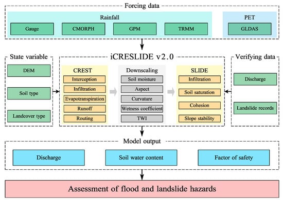 The iCRESLIDE model couples the CREST and SLIDE models through the soil moisture and infiltration processes. Soil moisture is an output variable in the hydrological processes of the CREST model, while the infiltration process changes the degree of soil saturation and thus further impacts slope stability in the SLIDE model. The iCRESLIDE model can simulate and predict floods and landslides simultaneously, making it both beneficial and efficient. However, the iCRESLIDE model is typically only suitable for small-scale studies. As the study area increases in scope, the model becomes more inefficient and may even terminate [].