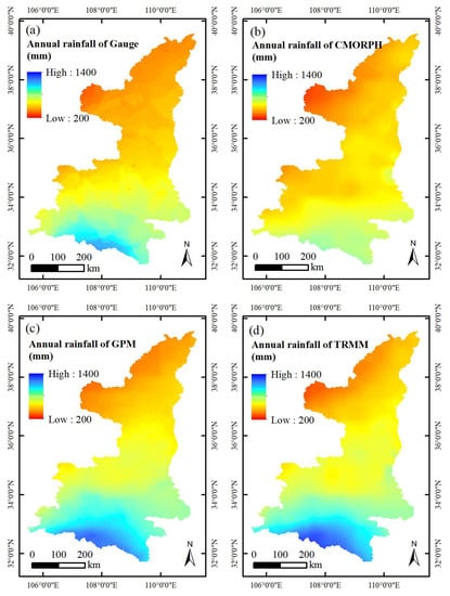 Spatial distribution of annual rainfall: (a) Gauge; (b) CMORPH; (c) GPM; and (d) TRMM.