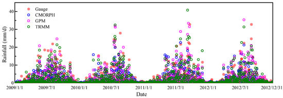 The regional daily average rainfall was computed, as presented in Figure 4. Generally, the highest rainfall occurred from July to September, indicating a strong monsoon characteristic. Compared to gauge rainfall (the red dot in Figure 4), CMORPH rainfall (the blue circle in Figure 4) appeared to be lower, while GPM and TRMM rainfall (the pink and green circles in Figure 4, respectively) were higher, consistent with the spatial maps for the four rainfall data sets. The maximum daily rainfalls for gauge, CMORPH, GPM, and TRMM were 32.77 mm, 22.57 mm, 35.32 mm, and 40.75 mm, respectively, suggesting that GPM rainfall is similar to gauge rainfall in extreme situations. The statistics reveal that the Ccs between gauge rainfall and CMORPH, GPM, and TRMM rainfall were 0.63, 0.72, and 0.74, respectively, while the relative biases were −9.02%, 17.70%, and 18.58%, respectively. Although CMORPH rainfall had the lowest relative bias, its Cc was also the lowest. The Ccs for GPM and TRMM rainfall were comparable, but the relative bias of GPM rainfall was lower than that of TRMM rainfall. Furthermore, CMORPH rainfall appeared to be higher in April and May, and this could significantly impact the simulation.
