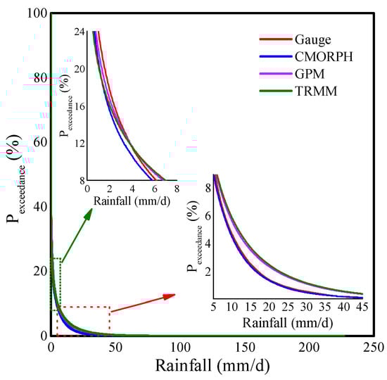 The probability of exceedance for each of the four rainfall data sets was also calculated (Figure 5). CMORPH rainfall was consistently the lowest among the four rainfall data sets. The exceedance probability of gauge rainfall was highest when rainfall was less than 3 mm/d (the upper-left inner chart in Figure 5). As rainfall increased, the exceedance probability of gauge rainfall decreased, approaching that of CMORPH rainfall. The exceedance probability of TRMM rainfall exhibited significant variability: it was lowest when rainfall was less than 1 mm/d but increased substantially and became the highest when rainfall was greater than 4 mm/d (the bottom-right inner chart in Figure 5). This indicates that TRMM rainfall has considerable variation and requires significant improvement in quality. Among the four rainfall data sets, the exceedance probability of GPM rainfall was the most stable. When rainfall was less than 3 mm/d, the exceedance probability of GPM rainfall was closest to that of gauge rainfall, when compared to the exceedance probabilities of CMORPH and TRMM rainfall. However, when rainfall was greater than 5 mm/d, the exceedance probability of GPM rainfall was similar to that of TRMM rainfall, indicating that GPM rainfall generally overestimates actual rainfall during heavy rainfall events. This should be taken into account when using GPM rainfall for research purposes.
