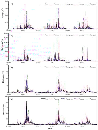 Observed and modeled daily discharges forced by the four rainfall data sets at the four hydrological stations: (a) Lueyang Station; (b) Shiquan Station; (c) Nanronghua Station; and (d) Taoyuan Station.