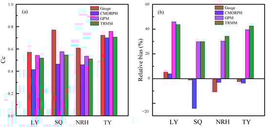 Evaluation metrics of: (a) Cc and (b) relative bias of modeled discharges for the four rainfall data sets at four hydrological stations. Here LY, SQ, NRH, and TY are the short forms of Lueyang, Shiquan, Nanronghua, and Taoyuan, respectively.
