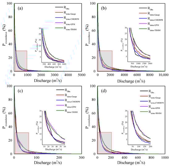 Probability of exceedance for observed and modeled discharges for the four rainfall data sets: (a) Lueyang Station; (b) Shiquan Station; (c) Nanronghua Station; and (d) Taoyuan Station.