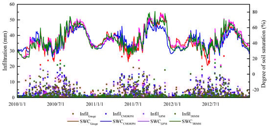 In the iCRESLIDE v2.0 model, slope stability is related to soil water content, which is influenced by rainfall infiltration. To investigate the relationship between rainfall infiltration and soil water content, we calculated the regional average infiltration and degree of soil saturation, as shown in Figure 9. Generally, the infiltration under CMORPH rainfall (blue square) was the lowest, while the infiltration under both GPM and TRMM rainfall (the pink and green squares in Figure 9) was similar to that under gauge rainfall (red square). Despite GPM and TRMM rainfall being greater than gauge rainfall, the infiltration results were not significantly different. This could be due to the fact that the rainfall of all three data sets exceeded the infiltration capacity. The degree of soil saturation has a strong relationship with infiltration, and changes in the degree of soil saturation are similar to those in infiltration, particularly in spring and summer. The soil saturation degree of CMORPH rainfall (blue line) was generally the lowest throughout the study period, except for April and May, consistent with the fact that CMORPH rainfall was high during these months. Additionally, the degree of soil saturation under GPM rainfall (pink line) was similar to that under gauge rainfall (red line), particularly from September to November in 2011, indicating that the simulation of hydrological processes forced by GPM rainfall was similar to that forced by gauge rainfall under the same model parameters. Overall, the results suggest that the iCRESLIDE v2.0 model is capable of capturing the relationship between rainfall infiltration and soil water content, which is crucial for accurately simulating slope stability and landslide hazards.