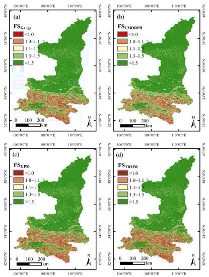 Minimum FS of the study area during the modeled period: (a) Gauge; (b) CMORPH; (c) GPM; and (d) TRMM.