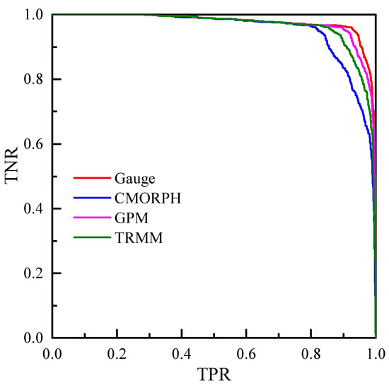 We also calculated the ROC curves of the modeled results derived from the four rainfall data sets (Figure 11). The ROC curve for gauge rainfall was the closest to the upper-right corner, with the greatest AUC value (0.976), indicating that the iCRESLIDE v2.0 model has reliable landslide prediction ability. Moreover, the curve of gauge rainfall had the highest TPR value at the same TNR value among the four curves in most cases, indicating that the model was accurate for not only landslide prediction but also non-landslide simulation. The ROC curve of CMORPH rainfall was the lowest and had the smallest AUC value (0.951), which may have been due to it having the lowest rainfall. The ROC curves of GPM and TRMM rainfall were both close to the upper-right corner, with AUC values of 0.973 and 0.965, respectively. The ROC curve of GPM rainfall was the closest to that of gauge rainfall, when compared to CMORPH and TRMM rainfall, indicating that GPM rainfall has high precision and may be effectively used for regional landslide prediction. Overall, the results suggest that the iCRESLIDE v2.0 model is reliable in landslide prediction, and that the GPM rainfall data can serve as a suitable alternative to gauge rainfall data for regional landslide prediction.