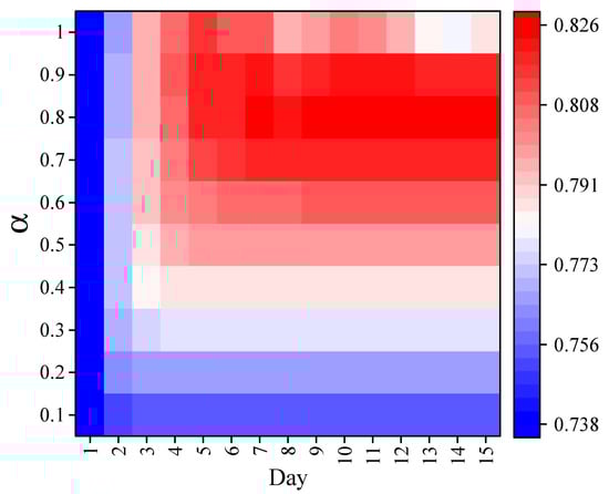 where is the effective rainfall, is the rainfall duration, is the coefficient of effective rainfall, and denotes the th day’s rainfall before the landslide event. The value of α can vary in different regions. Therefore, we calculated the Cc of effective rainfall and landslide events under different values of α and different antecedent days, as shown in Figure 12. The results indicate that the Cc is highest when α is equal to 0.8 and the antecedent day is 12. Therefore, we determined the coefficient of effective rainfall to be 0.8.