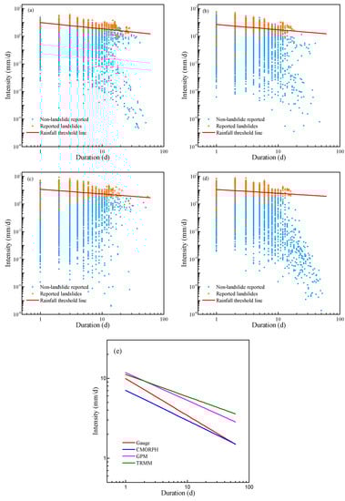 Rainfall threshold lines of ID model: (a) Gauge; (b) CMORPH; (c) GPM; and (d) TRMM rainfall. All the four threshold lines are shown in sub-figure (e) in order to compare these lines directly.