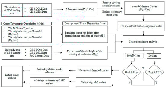 To improve the accuracy of the CSFD method, we identified the craters within the study area, simulated the topography degradation of craters using the crater degradation model, and compared it with the existing morphological state of the crater; we selected all craters on the geologic unit with the same degradation experience by analyzing the degradation process of craters. The flowchart of this study is shown in Figure 1, which mainly consists of four steps including the selection of the study area and data preparation, spatial randomness evaluation of the crater distribution, analysis of the crater degradation process, and the CSFD dating of the investigated area.