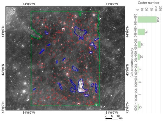 A region surrounding the CE-5 landing site was selected as the investigated area of this work (green square in Figure 2). Based on the 7 m/pixel digital orthophoto map (DOM) of the CE-2 CCD stereo camera [40], we mapped the craters within the study area using the CraterTools extension of ArcMap [41] and removed the obvious secondary craters (blue area in Figure 2) through their chain- and cluster-shaped distributional features. Finally, 353 craters ≥ 350 m in diameter were identified in the study area (red circle in Figure 2). The total area of crater count area is 5331.06 km2.