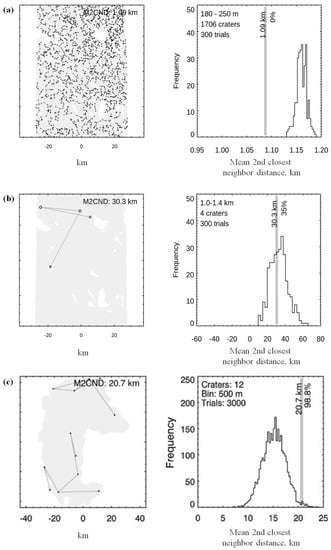 The specific steps are as follows: (1) We identified all craters within the study area, divided the craters into different groups according to their diameter range, and calculated the number of craters for each size group. (2) We conducted Monte Carlo simulations for each group. First, we generated craters of the same size and number as the measured data within the study area. Then, we calculated the ratio of MCND/M2CND among these craters and repeated this several times to obtain the histogram of MCND/M2CND of craters. (3) We compared the measured MCND/M2CND with the simulated (calculated) MCND/M2CND and assessed the randomness of the craters’ distribution for each size group. If the measured value was smaller than the lower limit of the histogram, the spatial distribution of craters was non-random and clustered (Figure 3a); if the measured value was within the range of the confidence interval of the histogram, the spatial distribution of the crater was random, and its randomness can be expressed as confidence percentage. The area in the histogram that was larger than the average of the measured MCND/M2CND was termed the non-clustered confidence percentage (Figure 3b). If the measured value was higher than the upper limit of the histogram, the craters were more ordered than random (Figure 3c). In this work, we used this method to analyze the randomness of the crater distribution of the study area, excluded craters of non-random distribution for each size group, and selected craters within the non-clustered confidence interval to participate in the subsequent dating analysis.