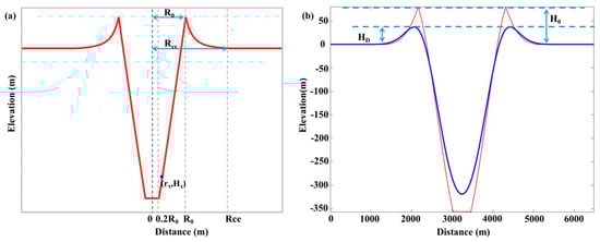 Crater profile simulated using the Crater Degradation Model. (a) Original crater profile ((rx,Hx) are the coordinates of any point located on the crater profile, rx is the distance between the point and the central axis of the crater, Hx is the elevation where the point is located; R0 is the crater radius, and Rce is the crater ejecta blanket radius (for craters with D < 1 km)). (b) Diagram of the crater profile after a certain time degradation: the red line is the original crater profile, the blue line is the degraded crater profile, H0 is the original crater rim height, and HD is the crater rim height after degradation.