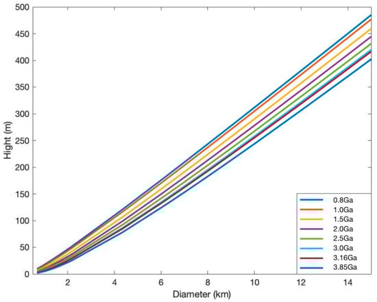In this study, we calculated the rim height (HD) of craters (0 < D ≤ 15 km) after experiencing the degradation process of 0.8 Ga, 1.0 Ga, 1.5 Ga, 2.0 Ga, 2.5 Ga, 3.0 Ga, 3.16 Ga, and 3.85 Ga years. The relationship between the rim height and diameter of craters of varying sizes and experiencing different degradation times is shown in Figure 5.