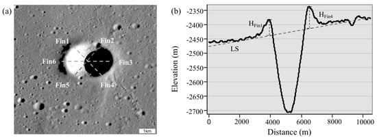 Diagram of the height extraction of the crater rim of the existing crater. (a) Image of the crater with 6 points Fin1−Fin6 selected at 60° intervals along the crater rim. (b) Elevation profile of the crater after two points Fin1 and Fin4; HFin1 and HFin4 are the elevation values from the crater rim where Fin1 and Fin4 are located to the lunar surface (LS), respectively.