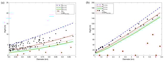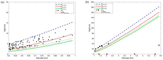Plot of the results of the size—rim height distribution of craters (D ≥ 500 m) in the study area. (a) The distribution of HD and HFin of craters (0.5 km ≤ D < 1 km). The blue, red, and green lines indicate the HD(1.0Ga), HD(2.0Ga), and HD(3.0Ga) of each crater fitted by the crater topography degradation model, respectively, and the black dots indicate the HFin of each crater in the CE-5 landing area. (b) The distribution of HD and HFin of craters (D ≥ 1 km). Black dots mean to meet the diffusive degradation process, and red dots means not to meet the diffusive degradation process.
