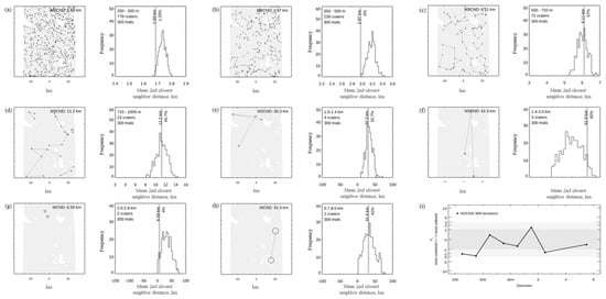 Plots of the results of crater randomness analysis in each diameter range in the study area. (a–f) Plots of the analysis results based on the M2CND clustering method; (g,h) plots of the analysis results based on the MCND clustering method; (i) n–sigma plots of the crater randomness analysis in each diameter range.
