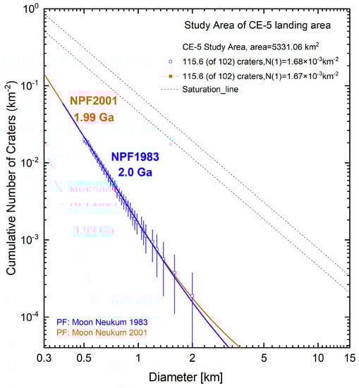Subsequent studies slightly modified the coefficients of Neukum Production Function (NPF) based on the new statistical data [20,23,48], and the two production functions were termed as NPF983 and NPF2001, respectively. By calculating the relationship between the radiometric ages of Apollo samples and the cumulative frequency of craters counted from the image, Neukum obtained a crater chronology function (Equation (5)):
