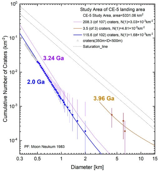 Plot of the results of estimating the surface age of the study area using different crater data. Blue is the age (2.0 Ga) calculated from 102 diffusively degraded craters screened by the method proposed in this study, purple is the age (3.24 Ga) calculated from all D ≥ 500 m craters, and tan is the age (3.96 Ga) calculated from 3 large non-diffusively degraded craters. The dotted lines are the 5% and 3% saturation lines; the saturation function formula applied is Ncum = 1.54 D−2 [50].