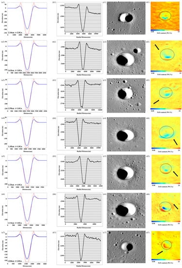 Simulated degradation state of diffusively degraded craters in the study area compared with the existing actual state (D ≥ 1 km). Figures (a1–a7) are the simulated degradation state profiles of craters, the red line is the profile of the crater, and the blue line is the profile after the crater degradation is simulated using the crater degradation model. (b1–b7) are the existing elevation profiles of craters, (c1–c7) are the existing state images of craters, and (d1–d7) are the FeO content distribution maps of crater, the black arrow points to the ejecta of the crater.