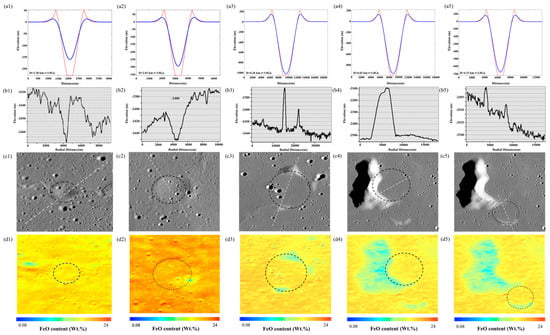 Simulated degradation state of non-diffusively degraded craters in the study area compared with the existing actual state (D ≥ 1 km). Figures (a1–a5) are the simulated degradation state profiles of craters, the red line is the profile of the crater, and the blue line is the profile after the crater degradation is simulated using the crater degradation model. (b1–b5) are the existing elevation profiles of craters, (c1–c5) are the existing state images of craters, and (d1–d5) are the FeO content distribution maps of crater.