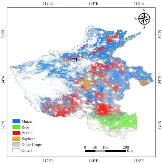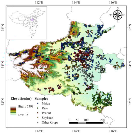 Henan is a province in central China that covers a total area of approximately 1.67 × 105 km2 (31.38–36.37°N, 110.35–116.65°E; Figure 1). The terrain of Henan is varied, with hills and mountains in the west and the Yellow–Huaihe alluvial plain in the east. The southwestern part is mainly the Nanyang Basin. The plain and basin, as well as the hills and mountains, make up 55.7% and 44.3% of the total area, respectively. Most of Henan has a warm temperate climate, with some areas transitioning into the subtropical zone. It has an annual average temperature ranging from 10.5 to 16.7 °C, with average annual sunshine hours ranging from 1285.7 to 2292.9 h and an average annual precipitation ranging from 407.7 to 1295.8 mm []. The favorable geography and climate provide suitable conditions for agricultural production, with the main focus on two crops per year. According to the National Bureau of Statistics, Henan’s sowing area for grain crops was 1.08 × 105 km2 in 2021, accounting for 9.16% of China’s total sowing area for grain crops. Grain production was 6.54 × 107 t, accounting for 9.58% of the national total, and played a significant role in the country’s overall grain production. According to the Henan Provincial Statistical Yearbook, Henan’s autumn harvest crops are mainly maize, peanuts, rice, and soybeans. Maize is widely distributed throughout the province and is the main crop of most prefecture-level cities. Peanuts are also widely distributed throughout the province, mainly in Kaifeng, Nanyang, and Zhumadian. Rice is mainly grown in Xinyang in the south. Soybeans are mainly grown in Zhoukou, Shangqiu, and Xuchang. In addition, sweet potatoes, cotton, tobacco, medicinal herbs (mainly yams), flowers, and different types of fruits and vegetables are grown in the Henan Province using greenhouses and piecemeal planting systems, collectively referred to as “other crops” in this paper. The concentration of other crops is mainly distributed in the central and eastern regions of the Henan Province. Maize, peanuts, and soybeans are typically planted from late May to early June and harvested from late September to early November. Rice is transplanted in May and harvested from late September to early October. The growth period of other crops is generally longer than that of the above crops, with an early planting and late harvesting time.