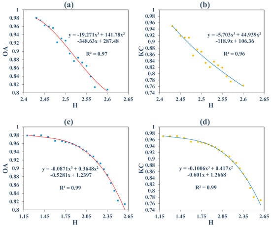 The OA and KC of the remaining crop type map as a function of the information entropy H. OA of Scheme 1 (a), KC of Scheme 1 (b), OA of Scheme 2 (c), KC of Scheme 2 (d).