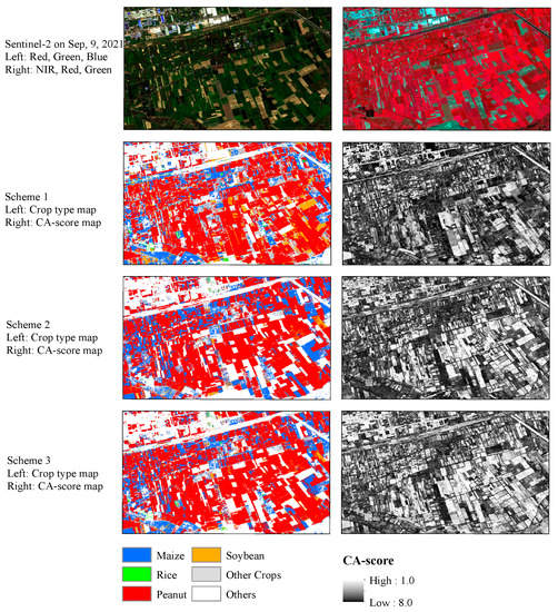 In addition, the CA-score can provide a more comprehensive visual interpretation of classification accuracy at the pixel scale. Therefore, we selected a case region from the crop type map, combined with the CA-score images and Sentinel-2 images, to further compare the classification accuracy of different classification methods.