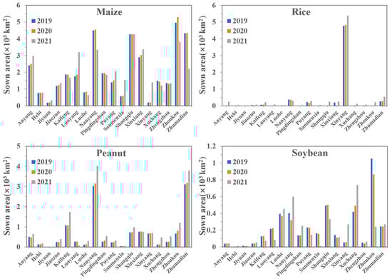 Although OA and KC achieved considerable success, there may still be some omissions or additions. To further verify the accuracy of the crop type map, it was compared with statistical data. As of the submission of this manuscript, the Henan Provincial Statistical Yearbook had not yet updated the 2021 statistics, so we used the agricultural statistics for 2019 and 2020 for comparison. The statistical data for other crops in agricultural statistics are annual, so we did not compare other crops. Firstly, the areas of different crops were compared at the provincial level. Secondly, we used the mean of the 2019 and 2020 statistical data to conduct a correlation test on the prefecture-level data (Table 4). The coefficients of determination (R2) of maize, rice, peanuts, and soybeans were 0.69, 0.99, 0.98, and 0.30, respectively. Meanwhile, the RMSE values were 871.3 km2, 143.9 km2, 286.4 km2, and 215.4 km2, respectively. According to Figure 8, the areas of maize planting in Luoyang, Sanmenxia, Xinyang, Zhoukou, and Zhumadian were quite different from the statistical data. This discrepancy directly led to the large RMSE and small R2 of maize. Similarly, the soybean planting area in Nanyang, Sanmenxia, Xinyang, Xuchang, and Zhoukou showed significant differences from the statistical data, resulting in large RMSE and small R2 values for soybeans as well. We hypothesized that the possible causes of this could be either the structural adjustments in planting and the severe floods that occurred in July 2021, or the limitations of the images in effectively capturing the variability. Otherwise, the planting areas of various crops were almost the same as the city-level statistical data in the study area. The above results indicate that the mapping results of this study were highly consistent with the statistical data.