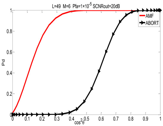 where is the incomplete Gamma function . According to the Equations (19)–(26), we can analyze the detection performance loss for AMF and ABORT under different mismatch angles .