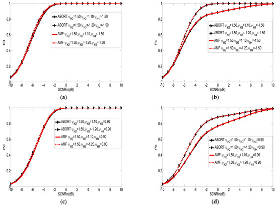 Pd and Pc versus of the proposed multiple hypothesis testing technique based on ABORT and AMF. (a) , , , ; (b) , , , ; (c) , , , ; (d) , , , .