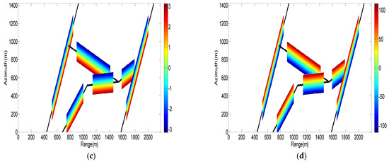 The master satellite does both transmit and receive, while other slave satellites only receive the radar echo. The simulated static scene is composed of several fields with different kinds of mean RCS, which include trees, buildings, roads, and so on. Additionally, there are eighteen simulated targets driving along the road, which are modeled as point targets. Figure 6a shows the simulated master satellite SAR image. In Figure 6a, the moving targets are buried within the clutter, which cannot be directly detected. Figure 6b shows the road map, which is derived from the road network database and the master satellite SAR image. In Figure 6c, the interferometric phase map is derived according to Equations (12)–(14), which only shown within to see with ease. In Figure 6d, the azimuth displacement map can also be derived from Equations (12)–(14) pixel by pixel, which also only show within small range corresponding to the interferometric phase map. For the proposed MHT technique, the entire phase map and displacement map should be applied to steering vector estimation and clutter suppression.
