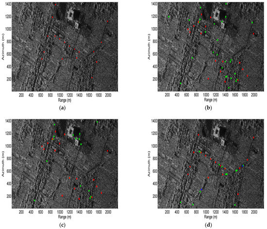 The SAR-GMTI signal processing results for AMF and the proposed method. (a) real positions of the eighteen simulated moving targets (red dots); (b) traditional AMF technique detection results (red dots represent the accurate detection results, green dots represent the false alarms); (c) detection results of the proposed method (red dots represent the accurate detection results, green dots represent the false alarms); (d) relocation results of the proposed method (red dots represent the accurate detection and relocation results, green dots represent the false alarms, blue dots represent the accurate detection and false relocation results).