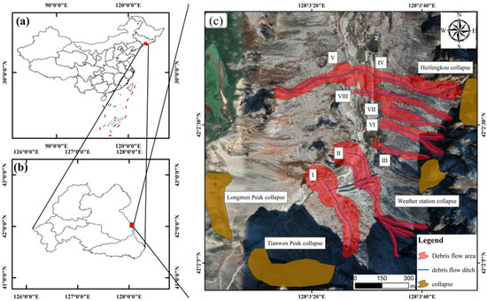 Distribution of disaster sites in study area. (a) Location of the study area in China; (b) location of the study area in Baishan City; (c) extent of debris flow and location of the collapse in the study area.