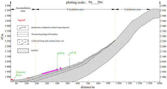 The eight tributaries in the study area are not composed of typical formation areas, formation circulation areas and accumulation areas. Therefore, according to the formation conditions and movement mechanism of debris flow and the distribution of loose solid sources of debris flow, the ditch area is divided into three areas: the catchment area in the upper reaches of the ditch, the formation circulation section in the middle reaches and the circulation accumulation area at the intersection of the ditch mouth to the Erdaobai River. The No. 1 ditch has the largest ditch area. Taking the No. 1 ditch as an example, Figure 2 is the GIS interpretation map of three sections of the No. 1 ditch, and Figure 3 is the cross section of the No. 1 ditch.