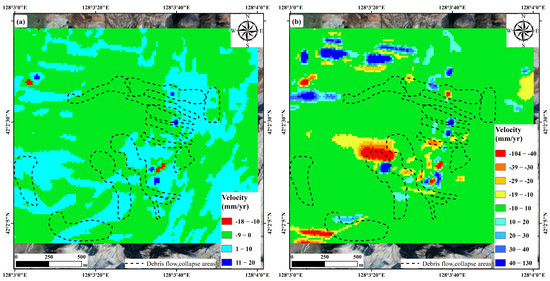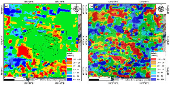 Results of surface deformation offset tracking in the study area (2017/01/01–2017/12/27). (a) Range direction; (b) azimuth direction.