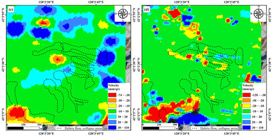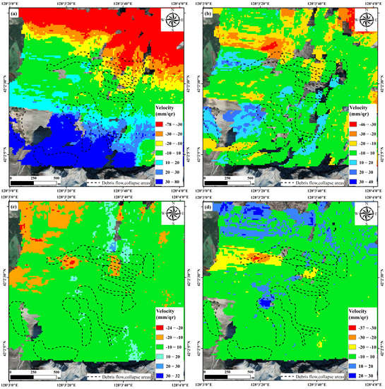 OT processing results of surface deformation in the study area in 2017. (a) Spring deformation (2017/03/07–2017/05/30); (b) summer deformation (2017/05/30–2017/09/03); (c) autumn deformation (2017/09/03–2017/11/26); (d) winter deformation (2017/11/26–2018/03/03).
