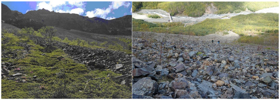 There are eight debris flows along the Erdaobai River in the northern scenic area of Changbai Mountain (Table 1). The Erdaobai River is generally a deep-cutting “U”-type valley, which has the characteristics of a steep slope and a large cutting depth. The longitudinal length of the main ditch is 9.1 km, and the average longitudinal slope of the main ditch is 48‰. Among them, the longitudinal slope of the upper reaches from the Tianchi waterfall to the intersection of the No. 6 branch ditch is steep, with an average longitudinal slope of 237‰, and the middle part of the Guanyatai section is slightly slow, with an average longitudinal slope of 105‰. In the lower reaches of the main ditch, the longitudinal slope is slightly slow, with a longitudinal slope of 51‰, and it shows obvious spatial variation characteristics of steep up and slow down.