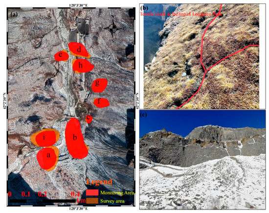 (a) North scenic dangerous area; (b) Longmen peak dangerous rock belt top; (c) Longmen peak dangerous rock belt side.