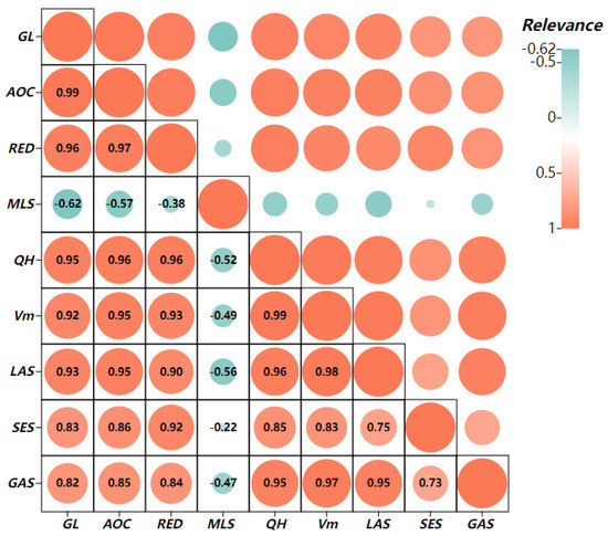 We analyzed the correlation and significance between debris flow solid outflow () and ditch length (GL), ditch area (AOC), relative elevation difference (RED), mean longitudinal slope (MLS), source reserve (), collapse accumulation source (LAS), slope erosion source (SES) and ditch accumulation source (GAS). Here, we also divide the provenance into slump deposit source, slope erosion source and ditch deposit source. Because of different debris flow gullies due to the different ditch forms, rainfall conditions and the distribution of material sources in the ditch, the main types of material sources involved in debris flow will be different. The correlation and significance analysis results pertaining to these characteristic parameters and the number of solid debris flows are shown in Figure 11 and Figure 12.