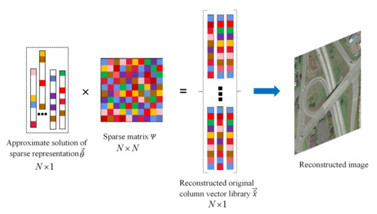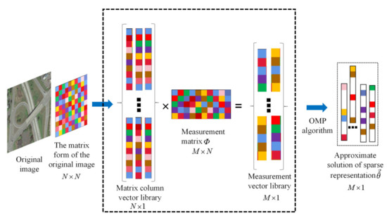 Algorithm 1 presents the execution steps of the OMP algorithm. As shown in Figure 2, we multiply the approximate solution by the sparse basis matrix ; then, the original signal recovered is . The final reconstructed image is obtained as follows: