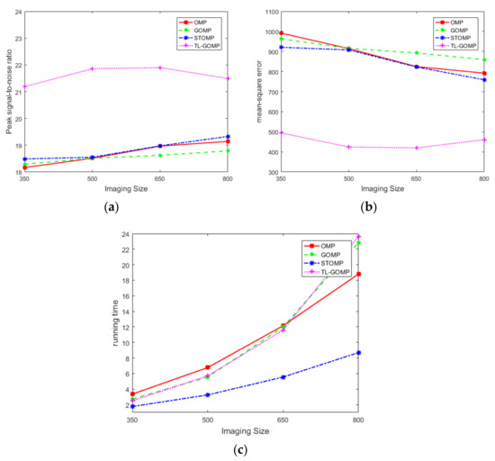 For this section, we selected test images with pixel values of 350 × 350, 500 × 500, 650 × 650, and 800 × 800 as the target scenes; four image reconstruction algorithms (OMP, STOMP, GOMP, and TL-GOMP) to perform image reconstruction simulation; and used peak signal-to-noise ratio and mean square error to evaluate the image quality. Figure 4a–d show the simulation results of the 800 × 800 image reconstruction. From an intuitive point of view, the improved TL-GOMP tracing algorithm can be used to further improve the quality of the reconstructed images. Table 1 presents the quality evaluation data and the code runtime for the 350 × 350 reconstructed images. From the perspective of quantitative data, we can also see that the PSNR values of the images obtained by the TL-GOMP algorithm increased by 15.82% (compared with the results of the GOMP algorithm), 14.60% (compared with the STOMP algorithm), and 16.63% (compared with the OMP algorithm). The MSE values of the images decreased by 48.64%, 46.30%, and 50.12%, respectively, and the code running time was relatively fast. Therefore, from the above simulation data, we conclude that the TL-GOMP algorithm based on compressed sensing can rely on sparse data collected by the PIC to restore the content information of the detected target.