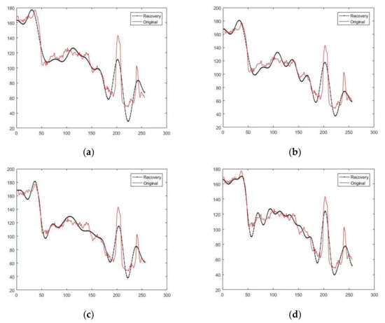 Reconstruction results of randomly selected single-column signals: (a) 1 time; (b) 50 times; (c) 100 times; (d) 200 times.
