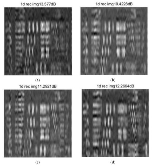 Figure 11 shows the simulation results after the reconstruction of restored images at d = 75, 125, 175, and 225 m using the compressed sensing TL-GOMP algorithm. We used two image quality evaluation indices, the peak signal-to-noise ratio, and the mean square error to measure the image quality. That is, the higher the peak signal-to-noise ratio, the better the image quality. Conversely, the lower the mean square error, the better the image quality. The simulation data in Table 20 show that the compressed sensing TL-GOMP image reconstruction algorithm is suitable for the content restoration of detected targets at different distances. “1d rec img” in Figure 11 represents the result of target reconstruction by TL-GOMP algorithm. We used the image quality evaluation function for evaluation of the reconstructed image; 13.5770 dB, 10.4228 dB, 11.2921 dB, and 12.2664 dB show the peak signal-to-noise ratio of the reconstructed image.