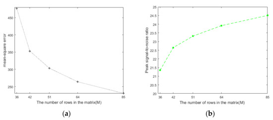 (a) Variation curves for the MSE of reconstructed images with matrix size M × N; (b) variation curves for the PSNR of reconstructed images with matrix size M × N.