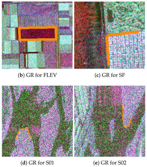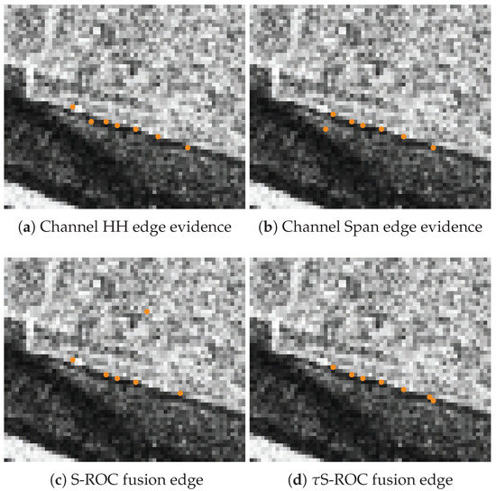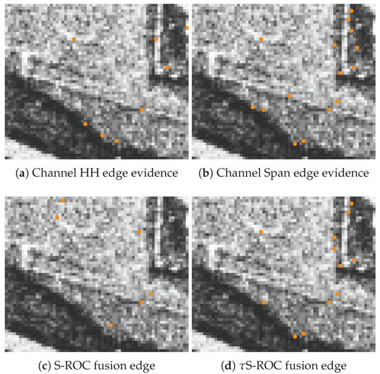 The images in Figure 16 show Pauli decompositions in gray-scale overlaid with edge evidence (Figure 16a,b) and edge detected with S-ROC and S-ROC (Figure 16c,d). The results shown in this figure were built thresholding by the likelihood of the points in each ray.