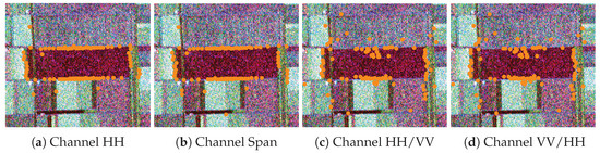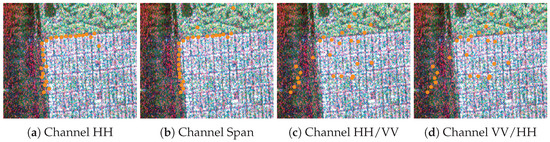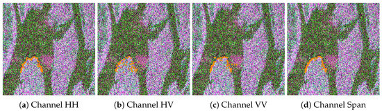 The span produces the best Hd; this result is compatible with the high visual quality of the span images. Including span in the fusion process is, thus, a recommendation. The worst detection performance occurs when using the HH/VV and VV/HH channels; therefore, including these bands in the process is not recommended.