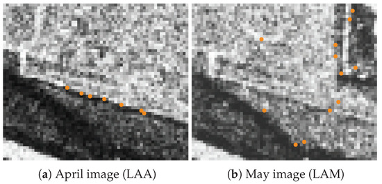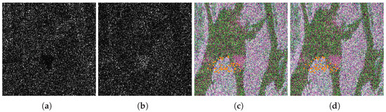 Figure 2 shows two coregistered images for the same regions in Los Angeles, CA, USA. The Jet Propulsion Laboratory/National Aeronautics and Space Administration (JPL) acquired the images using the Uninhabited Aerial Vehicle Synthetic Aperture Radar (UAVSAR) with L-band polarimetric multilook. Figure 2a was acquired on 23 April 2009, and Figure 2b on 11 May 2015. The images have pixels.
