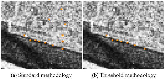 We apply the two methodologies, namely, the standard one and after applying the threshold to the LAA image; Figure 15 shows the results. Figure 15a shows the standard methodology, which shows the presence of outliers. Figure 15b shows the results thresholding by the likelihood; it performs well and does not wrongly identify edges on the relatively flat area. The edge estimates agree with the transition between the two regions. We only show channel HH; however, the results are consistent along all channels: thresholding by the likelihood systematically reduces the number of false positives and, at the same time, does not noticeably increase the number of false negatives.