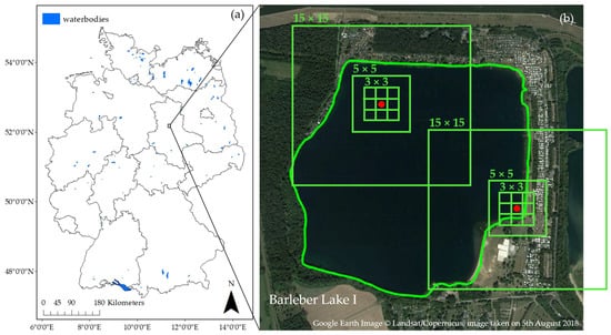 In order to address these complications in the validation of remote sensing products for water quality, we designed this study. We collected in situ observations of 112 inland waterbodies from different monitoring agencies in Germany from 2016 to 2020. The waterbodies varied in their morphometry and trophic state, resulting in 37.930 observations for all three variables prior to preprocessing. We generated the corresponding satellite-based products from the Copernicus satellites Sentinel-2 MSI and Sentinel-3 OLCI, and used two different processing schemes (CyanoAlert® from Brockmann Consult Ltd. in Hamburg, Germany and eoapp® AQUA from EOMAP GmbH & Co. KG in Seefeld, Germany). Subsequently, we compared the remote sensing data for different levels of spatial aggregation (pixel windows or “macropixels” of 1 × 1, 3 × 3, 5 × 5, and 15 × 15 as well as at the scale of the whole waterbody) (see Figure 1) and for temporal windows from the same day to up to ±5 days for different variables of water quality. We intentionally focused on processing workflows that are commercially available because applications in governmental or societal contexts are usually carried out in a consultancy setting. We quantified the deviations between satellite and in situ observations by using three different error measures. Thus, the research questions of this study were to find (i) what spatial aggregations of remote sensing data are appropriate for validation, (ii) which time window is adequate when comparing remote sensing and in situ data, and (iii) whether there are systematic differences in these characteristics depending on the variable of water quality, the satellite, or the processor.